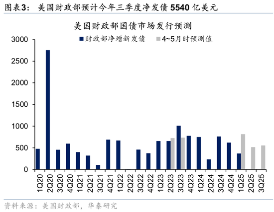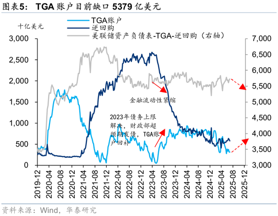 三季度美元流动性收紧的负面压力或低于市场预期,往后看全球流动性宽松可预见性更强。三季度权益资产面对的风险之一就是债务上限解决后的大规模发债导致金融流动性收紧。美国财政部预计今年三季度(自然年,下同)净发债5540亿美元,我们估算最终发债规模可能接近1万亿美元,但短期影响或小于2023年同期。1)发债规模:三季度净发债主要由两部分组成,一是赤字增长需要发债融资,二是补充TGA账户缺口。近期关税收入快速增长降低同期赤字水平,2025年至今美国赤字(6264亿美元)低于2023和2024年同期(分别为9716亿美元和7633亿美元)。以上半年的赤字降幅做季节性外推,三季度可能有4500亿美元新增赤字。TGA账户目前剩余3121亿美元,财政部计划在9月末补充至8500亿美元,缺口5379亿美元。2)结构上,财政部有动力更多发行短债。贝森特称在目前利率水平不应该增加长债发行[1]。目前美债期限溢价已经走高,假设美债利率上升至5%,其他条件不变,恒指回调幅度可能在5.3-5.7%附近。