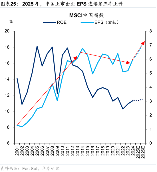 2025年,中国上市企业EPS连续第三年上升。EPS是衡量股权投资回报的核心指标。MSCI中国指数EPS在2002~2014年间年复合增长率15.7%,但2015~2022年间年复合增长率只有-2.94%。2002~2014年间,MSCI中国指数ROE均值15.4%,2015~2022年间趋势性降至10%左右。过去数年上市公司并未实现每股收益增长,就不难解释为什么指数中枢很难抬升;但一旦出现阶段性EPS预期改善,市场就容易快速反弹,如2017年和2020~2021年。2023年以来,ROE和EPS双双小幅回升,2024年确认趋势,FactSet一致预期2025及2026年进一步改善。去年至今年的行情并不能简单归结为流动性扩张,企业盈利的趋势性转好是中国权益市场在2024年“9.24行情”后中枢上移的根本性支撑。