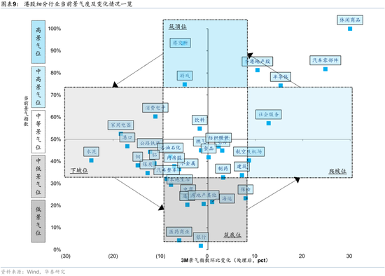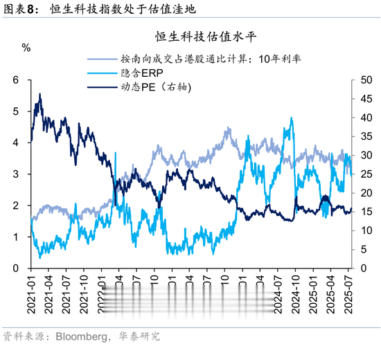 恒生指数短期只需要风险情绪调整就可能突破阻力位,恒生科技修复空间更大。具体细分板块上,我们建议优选景气改善+低估值行业。1)互联网方向,如电商、本地生活等细分板块景气有筑底态势,估值已经较为合理;游戏景气度较高,估值具有性价比;2)煤炭、水泥及周期品景气度或因“反内卷”提速而加速筑底;3)社会服务、纺织服装、航空机场等正处于估值不高+高景气的阶段;4)集中度较高的港股新消费景气度仍高,回调后是更好的介入机会。我们强调关注港股科技板块,其正处于景气修复+估值低位的交集中,且市值占整体港股接近1/3,更适合机构投资者“高切低”布局。