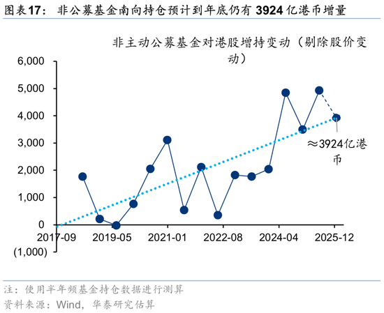 考虑到目前主动偏股型公募港股持仓占南向总持仓略超10%,来自保险、私募、个人投资者的资金增量或更加重要。剔除价格变动,上半年主动偏股公募和其他类型资金分别增配港股542亿、4922亿。按剔除恒生港股通股价变动,按2017年中至今趋势线性外推下非主动公募至25年底还有3924亿增量。