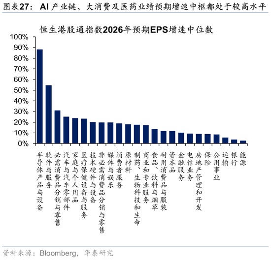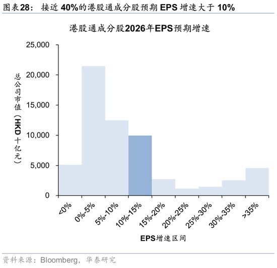 往后看,随着8月中报业绩期结束,下半年市场预期将逐渐切换至2026年,市场预期2026年港股盈利进一步修复。根据Bloomberg对个股业绩的一致预期,恒生港股通成分股EPS增速中位数落在5~10%区间,有接近40%的个股EPS增速大于10%。AI产业链相关、大消费及医药业绩预期增速中枢都处于较高水平。