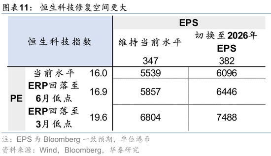 2)恒生科技:修复空间更大。港股科技板块正处于景气修复+估值低位的交集中,且市值体量大,更适合机构投资者布局。恒生科技指数动态PE低于2020年7月以来均值23.8X,ERP高于1.8%的均值。过去由于基本面的一些负面压力,恒生科技在此前板块轮动中被市场阶段性忽略。在上述无风险利率水平下,假设恒生科技指数股权风险溢价降至上半年DeepSeek行情最低点1.6%,则动态估值或将从现在的15.7倍上升至19.8倍。如果保守假设股权风险溢价只修复到6月低点(“外卖大战”前),恒指估值可以提升至17倍。同样的,年底动态EPS将切换为2026年预期,彼时即便估值如现在水平保持不变,指数都存在较高的抬升空间,若风险溢价调整则空间更大,情景分析见图11。