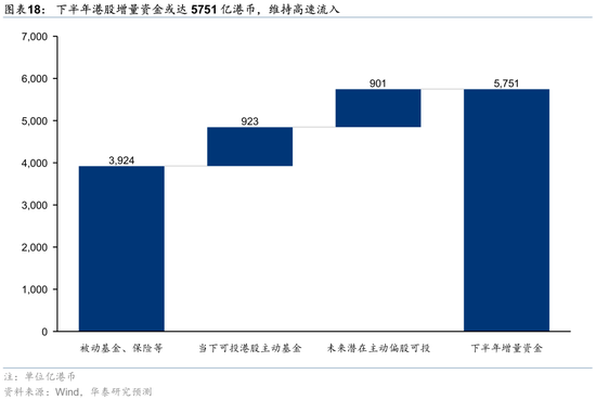 未来主动偏股公募或可提供1800多亿港币增量资金,南向持股占比90%的私募、保险、个人等或还有近4000亿增量,下半年总体增量略低于上半年,但仍高于历史水平。