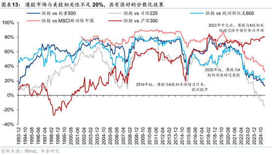 在《港股重估蓄势待发》(2025.5.23)中我们就指出,所谓“去美元化”并非资金全部离开美国,而是超配美元资产的海外资金(多数在亚洲和欧洲,包括中国自身的离岸资金)有回流和分散的诉求。2023年底以来,港股市场与美股市场表现的相关性不足20%、是全球第六大股市场、且资金可自由流通,是承接这部分分散资金的重要阵地。