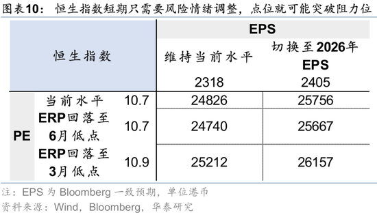 从空间上看,1)恒生指数:短期只需要风险情绪调整,点位就可能突破阻力位。假设美债利率升至4.7%、中债利率不变,港股使用的,按港股通成交占比计算(当前已经达到40%)的10年无风险利率估计上升幅度不大,若股权溢价回到年内低点5.7%,恒生指数前向估值有望从10.6倍升至10.9倍。到年底,市场动态EPS将切换为2026年预期,在市场一致盈利预期下,恒指远期中枢或更高,情景分析见图10。