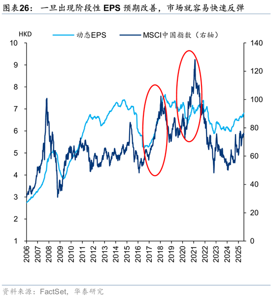 企业盈利正在改善,港股表现有基本面支撑。去年至今年中国资产的行情并不能简单归结为流动性扩张,企业盈利(ROE和EPS)的趋势性转好是中国权益市场在去年“9.24行情”后中枢上移的重要支撑。2025年,MSCI中国指数EPS连续第三年上升,市场预期2026年EPS和ROE继续修复