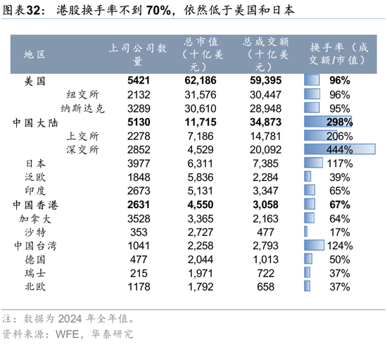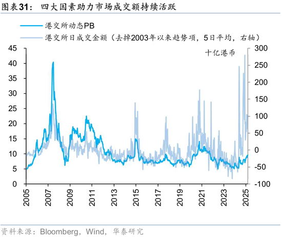 四大因素助力市场成交额持续活跃。2024年全年港股换手率不到70%,依然低于美国(96%)和日本(117%)等全球主要的发达金融市场。参考华泰多元金融报告《香港交易所:人民币升值预期下的价值重估》(2025.5.21),未来四大因素或助力香港市场成交活跃度持续上升。1)历史上人民币升值通常伴随着港股ADT上升;2)美联储年内的潜在降息和HIBOR低位也有助于提升香港市场的整体流动性,并推升交易活跃度;3)港股IPO融资24年以来持续活跃,长期有望抬升ADT中枢;4)换手率更高的南下资金在港股中参与度不断提升。