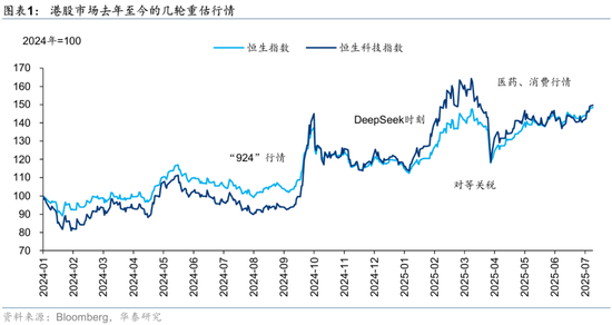 我们在年中展望《海外市场2H25展望:再平衡进行时,2025.6.3》中指出,一些可预见的变化如关税暂停期结束、上半年业绩出炉、美债发行上升收紧流动性等可能从风险溢价、盈利预期和无风险利率影响市场三季度的走势,无论是中国进一步政策支持还是美联储货币宽松都更大概率在三季度末到四季度出现。因此,我们彼时对下半年的港股市场给出了三个判断:1)关税扰动脱敏,基本面重要性上升。2)三季度呈现高波动状态,结构性行情为主线,四季度环境更适宜。3)港股市场重估空间更大,依然有相对表现机会。恒生指数从6月初突破24000点后,继续上行的持续性和动能有所减缓,基本符合预期。