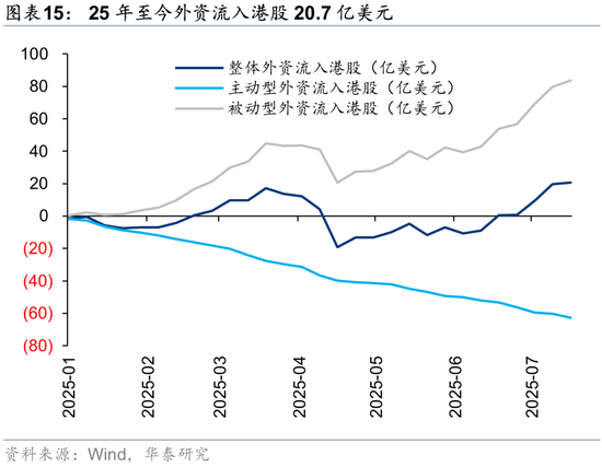 在美元走弱,国内地产调整进入后半场的大背景下,外资已不再流出香港市场:1)EPFR口径下外资25年至今流入20.7亿美元vs.24年流入31.5亿美元),其中主动型外资流出62.9亿,被动性外资流入83.6亿;2)从国际中介持股口径看,2~3月及4月以来的港股两段行情中外资也有增持(分别增持0.8%、0.1%)。结构上,年初科技行情期间外资减持红利及创新药(-0.5%、-0.2%),增持AI科技及新消费(0.8%、1.1%),4月以来趋势进一步强化;3)美元港币汇率视角下,年初DeepSeek行情引爆科技股投资热潮,随后在港美利差并未扩大的情况下,香港多次触发联汇制度下的强方兑换保证;4)外资作为重要的基石投资者参与港股IPO,已累计认购超210亿,占到基石投资者认购金额半数。在人民币不再贬值甚至有升值预期的大背景下,我们对外资在中国资产进行分散性配置的需求并不悲观。